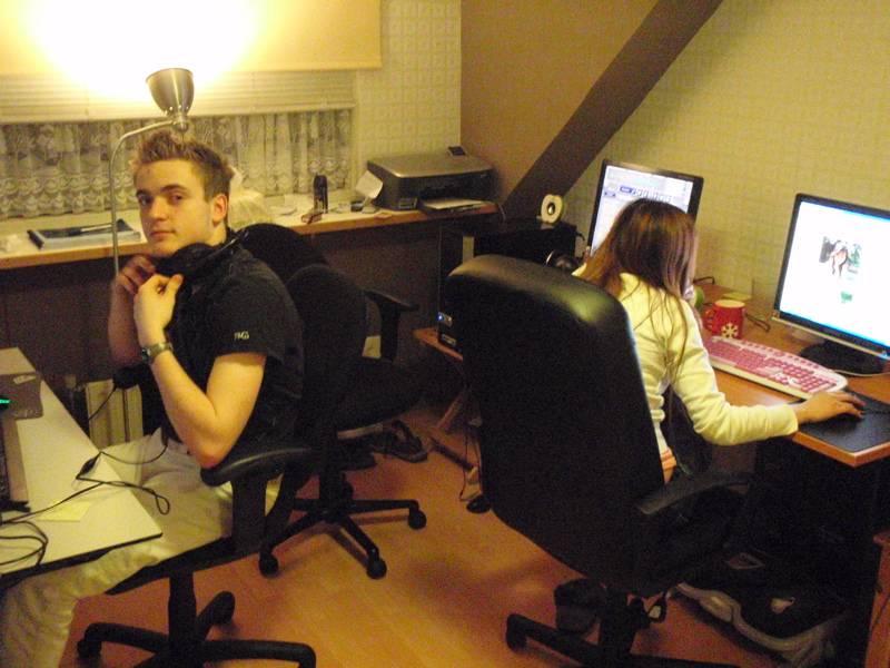 Прямо у входа в комнату находится витрина со всеми трофеями и наградами Grubby. На стенах висят портреты героев из Wс3, таких как Иллидан или Артас на ледяном троне. Еще на стене висят фотографии с WCG 2008, когда команда Grubby победила. Слева в комнате стоят компьютеры, некоторые принадлежат Grubby, а некоторые – Кассандре. Ну, а напротив компьютеров, как вы видите, сижу я со своим снаряжением.