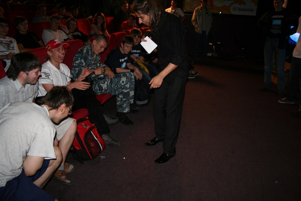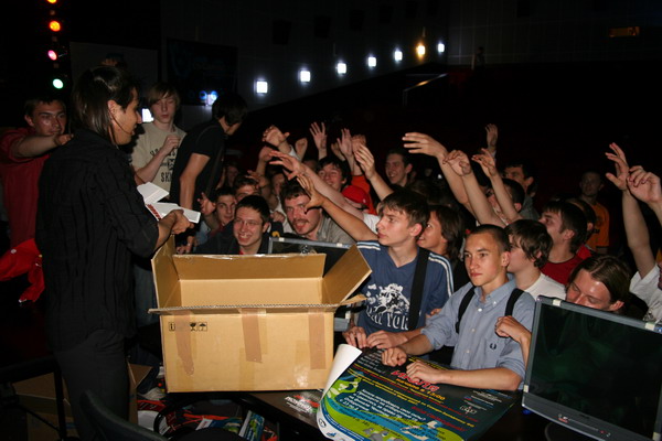 Тем временем очередная игра закончилась, и наступила пора конкурсов. Битва за монитор развернулась нешуточная. Фаня (MadFan) и Брюс напару еле справлялись с жаждой толпы, каждый в которой хотел заполучить желанный экранчик. Но не тут-то было: отбор был жесткий - в три этапа, и в финале оказались питерец Евгений и Марина - Enigma. Парень Женя два раза почти отвечал на вопрос. Было видно, что он начитался ProPlay'я, но по рассеянности путал некоторые факты, поэтому монитор ему отдали. Просто стало ясно, что он только начал увлекаеться киберспортом, и мелкие помарки ему простили. Не помню, что там был за ответ в первый раз, но во второй раз он ответил, что WCG 2008 будет проходить в Германии, и уточнил, что в Гамбурге. Так как в вопросе не требовалось название города, то правильного названия страны оказалось достаточно, чтобы выиграть монитор. Повезло, в общем.