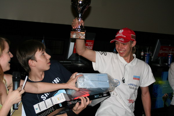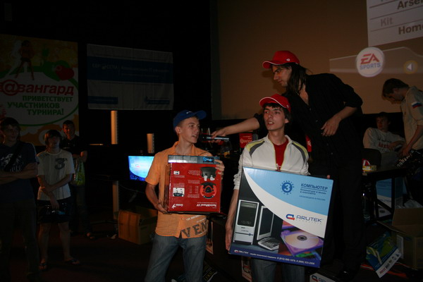 Пока шел турнир, я ходила и скрупулезно собирала данные по игрокам для сегодняшней новости, поэтому мне доверили объявлять победителей на сцене. На бедных финалистов было жалко смотреть: каждого заваливали мышкой, клавиатурой, флешкой, какими-то прикольными массивными ушами, сертификатами и первые места кубками. Все сыпалось из рук, пришлось даже помогать.
